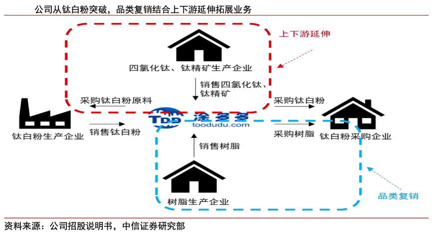 經典案例:根據(jù)公司招股說明書、中信證券研究部等綜合資訊表明,國聯(lián)股份涂多多在進入鈦行業(yè)時,先將鈦白粉作為核心單品進行突破,發(fā)展了一批鈦白粉生產上游企業(yè)和需要鈦白粉的塑料、涂料生產的下游企業(yè)作為客戶。公司在采購銷售鈦白粉的基礎上,與鈦白粉生產商建立了良好的合作關系,捕捉到鈦白粉生產商對四氯化碳和鈦精礦等產品的需求,從而將四氯化碳和鈦精礦納入涂多多的采購體系,低成本擴展公司業(yè)務和客戶。