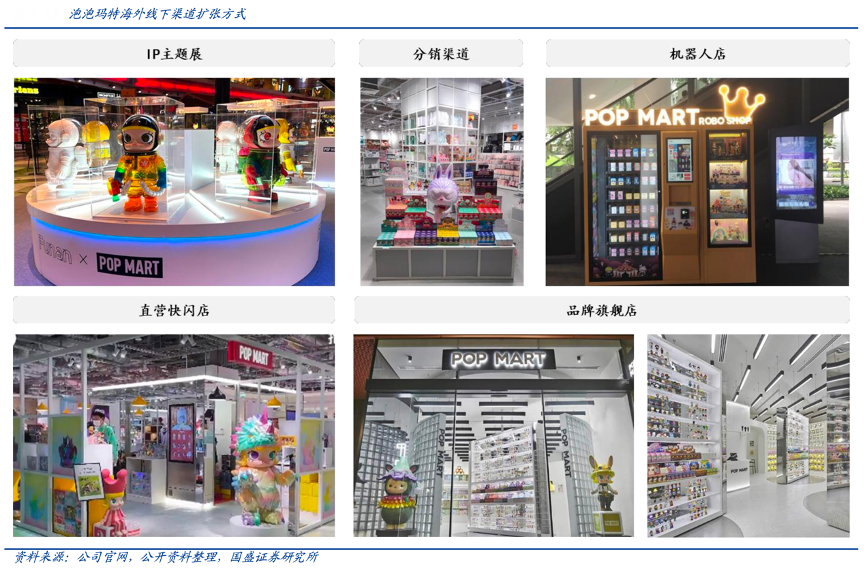 經(jīng)典案例:根據(jù)公司官網(wǎng)、公開資料整理、國盛證券研究所等綜合資訊表明,“IP 主題展+快閃店+機(jī)器人店”的組合打法成為了海外 DTC 渠道拓展的重要方式,能讓消費者直觀感知到 IP 與泡 泡瑪特品牌形象,以更輕量級、較低成本的方式衡量未來開店可行性。泡泡瑪特公司已在新加坡陸續(xù)開展 Dimoo、Space Molly 主題展,2021 年末在全球 14 個國家和地區(qū)開了 100 家 圣誕主題快閃店(2020 年末在 11 個國家地區(qū)開設(shè) 29 家快閃店)。