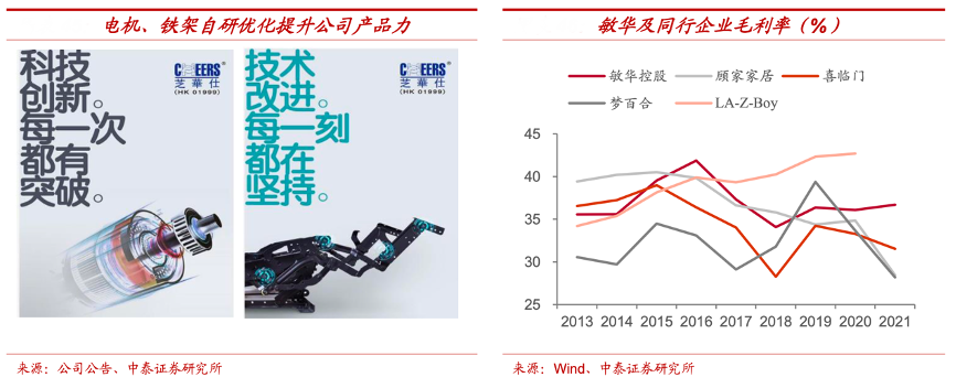 經(jīng)典案例:根據(jù)公司公告、wind、中泰證券研究所等綜合資訊表明,敏華在 2019 年突破歐式小型鐵架生產(chǎn)后,不斷攻克難題,逐步研發(fā)出“零重力平躺”、“零靠墻”、“美觀吊腳”等新型功能鐵架,實現(xiàn)尺寸小、美觀、輕盈、平躺等升級功能,助力公司功能沙發(fā)產(chǎn)品力升級,更加適應(yīng)消費者需求。