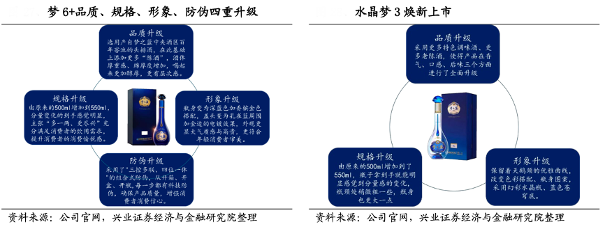 經(jīng)典案例:根據(jù)公司官網(wǎng)、興業(yè)證券經(jīng)濟與金融研究院等綜合資訊表明,洋河夢6+實現(xiàn)品質(zhì)、規(guī)格、形象、防偽四重升級。品質(zhì)上,夢6+選用頭排酒并增加陳年老酒的使用量,酒體更加厚重醇香;規(guī)格上產(chǎn)品容量從 500ml 增加至 550ml,性價比凸顯;形象上基礎(chǔ)瓶型不變,但對色彩搭配和瓶身圖案進行優(yōu) 化,塑造高端精品的典雅氣質(zhì);防偽上以高科技手段實現(xiàn)開箱、開盒、開瓶 的防偽,保證消費者購買和飲用的安全性。隨著主導大單品夢6+成功升級進入高速發(fā)展階段,水晶夢 3 重點從品質(zhì)、規(guī)格、形象跟隨升級。