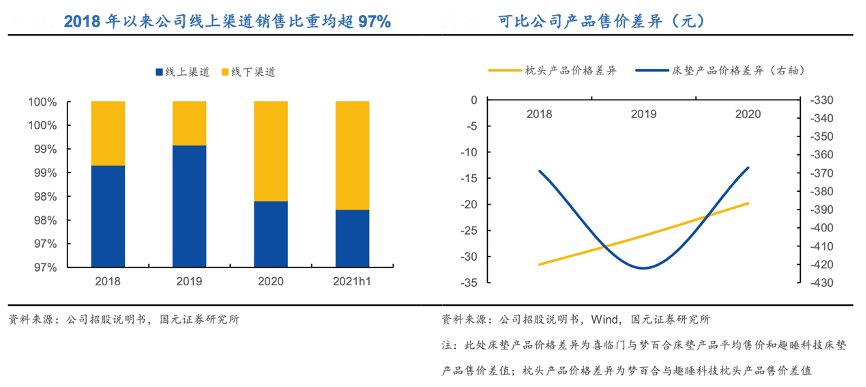 經(jīng)典案例:根據(jù)公司招股說明書、wind、國元證券研究所等綜合資訊表明,趣睡科技公司可結(jié)合電商平臺(tái)各類促銷和推廣方式,采取更為靈活的定價(jià)原則,從而帶來更高的產(chǎn)品溢價(jià)。與同行業(yè)可比公司同類產(chǎn)品價(jià)格進(jìn)行對(duì)比,可以看到公司在床墊和枕頭產(chǎn)品售價(jià)上均高于同業(yè)同類產(chǎn)品。