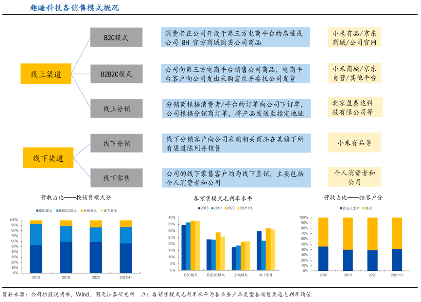 經(jīng)典案例:根據(jù)公司招股說明書、wind、國元證券研究所等綜合資訊表明,趣睡科技摒棄傳統(tǒng)線下銷售為主模式,通過線上渠道全覆蓋直接觸達(dá)終端消費(fèi)者。相較于行業(yè)傳統(tǒng)線下銷售、ODM/OEM 大宗業(yè)務(wù)為主的模式,其已實(shí)現(xiàn)線上 B2C 和 B2B2C 為主,線上分銷為輔的線上渠道全覆蓋。2018-2021H1其線上渠道銷售在營收中的比重均超過97%(同行業(yè)可比公司線上銷售占比約為 10%-50%),其中 B2C 銷售模式占比均超50%。