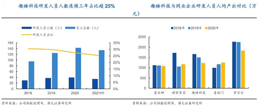 經(jīng)典案例:根據(jù)公司招股說(shuō)明書、國(guó)元證券研究所等綜合資訊表明,趣睡科技近年來(lái)不斷加碼產(chǎn)品的研發(fā)創(chuàng)新設(shè)計(jì), 2018-2020 年公司研發(fā)人員比重均超 25%,在研發(fā)人員人均產(chǎn)出上其也表現(xiàn)良好,位于行業(yè)平均水平。從研發(fā)費(fèi)用角度看,其研發(fā)費(fèi)用率常年超 1.1%。截至 2021 年 8 月,公司累計(jì)取得 174 項(xiàng)專利,掌握了壓縮打卷、免安裝工藝、抽屜分層、拼裝減震、人體工學(xué)結(jié)構(gòu)設(shè)計(jì)、鵝絨被斜立襯、枕頭復(fù)合結(jié)構(gòu)設(shè)計(jì)等核心技術(shù)。