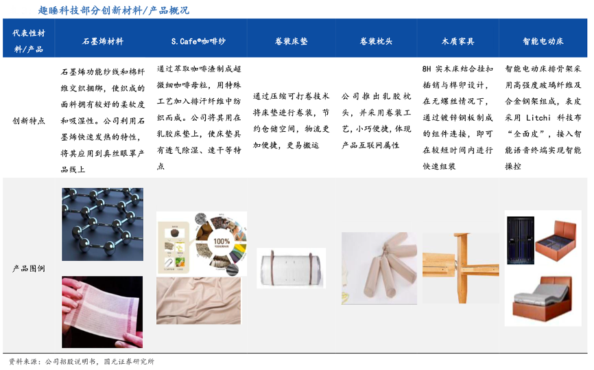 經(jīng)典案例:根據(jù)公司招股說(shuō)明書、國(guó)元證券研究所等綜合資訊表明,趣睡科技公司目前超過(guò)50%的產(chǎn)品款式使用新材料;在新產(chǎn)品方面,公司研發(fā)團(tuán)隊(duì)通過(guò)電商平臺(tái)大數(shù)據(jù)實(shí)時(shí)關(guān)注消費(fèi)者購(gòu)買需求及評(píng)價(jià),以推出遵循消費(fèi)者需求的創(chuàng)新產(chǎn)品。近年來(lái),其已先后推出卷裝床墊、卷裝枕頭、智能電動(dòng)床等創(chuàng)新產(chǎn)品,可滿足消費(fèi)者多種需求。
