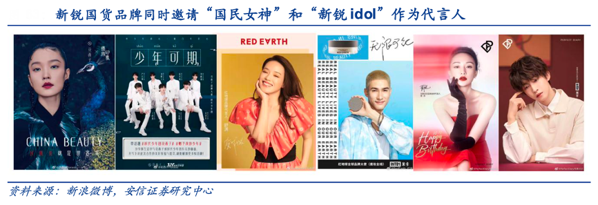 經(jīng)典案例:根據(jù)新浪微博、安信證券研究中心等綜合資訊表明,以巴黎歐萊雅為例,2019 年起其合作國(guó)內(nèi)明星超 25 位;而國(guó)貨品牌的代言人以“國(guó)民女神”和“新銳idol”為主,一方面能在短時(shí)間內(nèi)提高品牌知名度,擺脫人們對(duì)國(guó)貨“低檔”的刻板印象,另一方面也能打開彩妝主要消費(fèi)人群即年輕人的市場(chǎng)。
