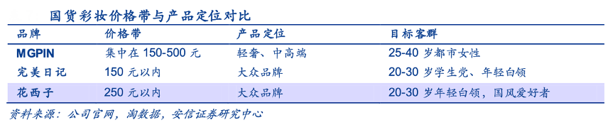 MGPIN 產(chǎn)品定位輕奢、中高端,價(jià)格帶集中在150-500元,主要面向25-40歲的都市女性,與完美日記、花西子等主要針對學(xué)生黨和年輕白領(lǐng)的大眾品牌拉開差距。MGPIN立足于東方美學(xué)理念,針對東方女性不同的面部特征、膚質(zhì)與膚色進(jìn)行產(chǎn)品設(shè)計(jì),更貼合國人需求。