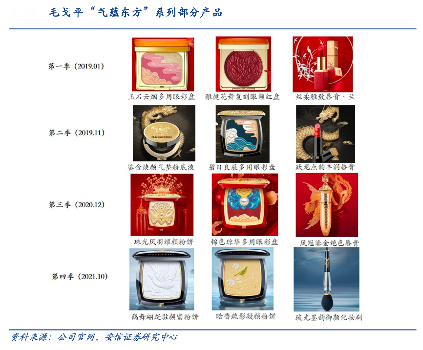 經(jīng)典案例:根據(jù)公司官網(wǎng)、安信證券研究中心等綜合資訊表明,2019 年 1 月,MGPIN 與故宮合作推出“氣蘊(yùn)東方”系列,包含粉底、眼影、口紅、腮紅等共 32 個(gè) SKU,產(chǎn)品名稱、包裝設(shè)計(jì)、壓粉圖紋均采用故宮藏品紋樣,極具東方韻味。