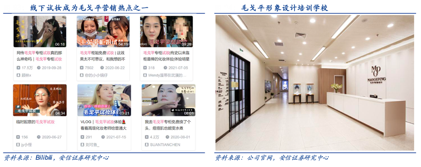 經(jīng)典案例:根據(jù)Billbill、公司官網(wǎng)、安信證券研究中心等綜合資訊表明,結(jié)合 CBNData,截至 2020 年 4 月,MGPIN 共有 244 家線下專柜,營收占比達到 70%-80%。每家專柜都提供試妝服務(wù),一方面讓客戶通過體驗妝效感受產(chǎn)品品質(zhì),幫助其選擇適合的產(chǎn)品,另一方面挖掘潛在需求,培養(yǎng)彩妝消費習慣,增強客戶粘性和復(fù)購率。