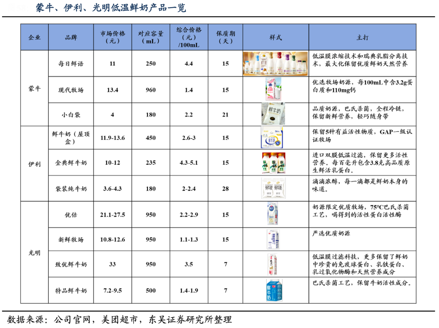 經(jīng)典案例:根據(jù)公司官網(wǎng)、美團(tuán)超市、東吳證券研究所等綜合資訊表明,全國乳企打造高端產(chǎn)品線,區(qū)域性乳企強調(diào)“鮮”價值。2018年,蒙牛和伊利相繼推出低溫鮮奶產(chǎn)品。蒙牛通過每日鮮語和現(xiàn)代牧場打造高端和中端產(chǎn)品線,按收入計 2021 年市占率達(dá)13.4%。光明旗下致優(yōu)和特品保質(zhì)期為 7 天,保留更多營養(yǎng)成分;新乳業(yè)開辟黃金 24 小時系列,強化極致新鮮理念。