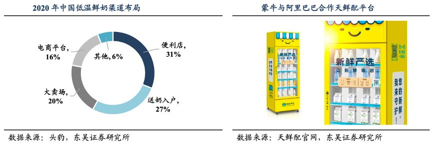 經(jīng)典案例:根據(jù)頭豹、天鮮配官網(wǎng)、東吳證券研究所等綜合資訊表明,2018 年初,光明攜經(jīng)銷商體系接入阿里巴巴零售通平臺,利用阿里巴巴零售通的技術(shù)建立數(shù)據(jù)化的管理系統(tǒng);并于 2019 年與阿里 云達(dá)成合作,在新零售、支付、物流、智慧門店等方面推動數(shù)智化轉(zhuǎn)型。2019 年阿里巴巴入股蒙牛旗下訂奶 O2O 平臺“天鮮配”,打造了“線上平臺訂奶,樓下智能冰柜取奶”的新模式,滿足消費者對鮮奶的口感追求。