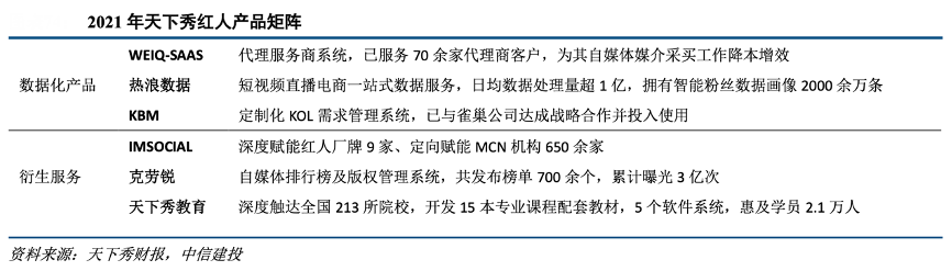 經(jīng)典案例:根據(jù)天下秀財報、中信建投等綜合資訊表明,天下秀紅人產(chǎn)品矩陣包括“數(shù)據(jù)化產(chǎn)品+衍生服務(wù)”,高效率賦能紅人經(jīng)濟(jì)價值變現(xiàn)。除 WEIQ 系統(tǒng)外,天下秀在數(shù)據(jù)產(chǎn)品方面新退出 WEIQ-SAAS、熱浪數(shù)據(jù)、KBM;同時提供一系列衍生服務(wù),包括 IMSOCIAL 加速器、自媒體排行及版權(quán)管理機構(gòu)克勞銳和教育品牌天下秀教育。