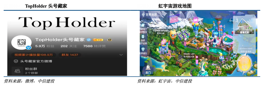 經(jīng)典案例:根據(jù)微博、虹宇宙、中信建投等綜合資訊表明,天下秀目前已推出 3D 虛擬社交軟件“虹宇宙”和自媒體數(shù)字藏品工具集“TopHolder頭號藏家”。“虹宇宙”已有紅人 IP 魚太閑、天才小熊貓等已入駐,與拉菲、龍湖集團(tuán)等公司達(dá)成合作意向,自上線內(nèi)測以來累計預(yù)約用戶已超過 40 萬;而“TopHolder 頭號藏家”已正式接入虹宇宙,并與微博達(dá)成戰(zhàn)略合作,為微博用戶提供原創(chuàng)數(shù)字藏品生成、發(fā)行、傳播及沉淀等服務(wù)。