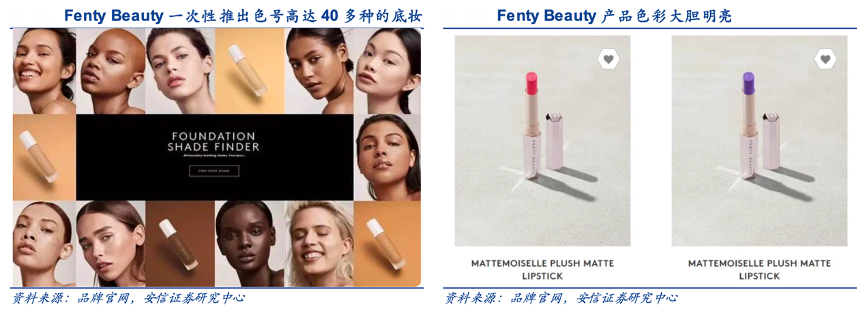 經(jīng)典案例:根據(jù)品牌官網(wǎng)、微博、安信證券研究中心等綜合資訊表明,enty Beauty 的爆紅首先依賴于 Rihanna 這一個(gè)人 IP 的熱度,其一次性推出色號(hào)高達(dá) 40 多種的底妝,充分滿足各種族多元化需求。同時(shí)其產(chǎn)品也高度創(chuàng)新,眼影、口紅色號(hào)大膽夸張,更是推出“身體高光”并為其親自拍攝宣傳片。