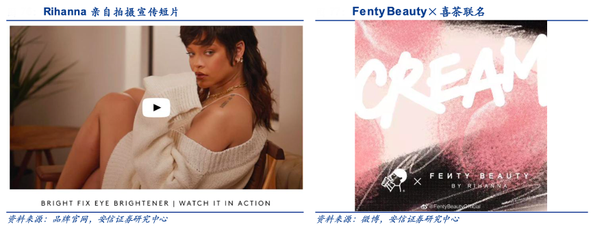 經(jīng)典案例:根據(jù)品牌官網(wǎng)、安信證券研究中心等綜合資訊表明,F(xiàn)enty Beauty 由流行天后 Rihanna 于 2016 年創(chuàng)立,隸屬 LVMH 集團(tuán)旗下,2019 年 9 月 Fenty Beauty 正式進(jìn)軍亞洲,開(kāi)通了微博、微信公眾號(hào)、小紅書 等社交賬戶,同時(shí) Rihanna 登上《時(shí)尚芭莎》封面為品牌制造聲量。為本土化營(yíng)銷,2020 年 5 月 Fenty Beauty 和喜茶推出聯(lián)名產(chǎn)品,進(jìn)一步提高在中國(guó)年輕人中的知名度。