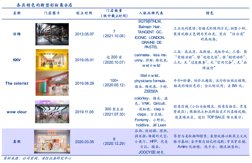 經(jīng)典案例:根據(jù)公司官網(wǎng)、安信證券研究中心等綜合資訊表明,2019年后新型彩妝集合店興起,以THE COLORIST、WOW CLOUR、喜燃、話梅等為代表的新型美妝集合店主打“產(chǎn)品零售 +服務(wù)體驗(yàn)”,通常開(kāi)在人流密集的商場(chǎng)及購(gòu)物中心的一層,裝修風(fēng)格明亮絢麗、讓人眼前一亮,注重沉浸式購(gòu)物,彌補(bǔ)了線上購(gòu)物不能試妝的缺陷,受年輕人喜愛(ài),成為“網(wǎng)紅打卡點(diǎn)”。