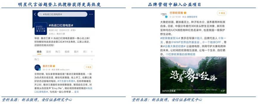 經(jīng)典案例:根據(jù)新浪微博、安信證券研究中心等綜合資訊表明,明星代言有長(zhǎng)期全線代言、細(xì)分產(chǎn)品線代言或短期合作等多種形式,以2019年肖戰(zhàn)代言雅詩(shī) 蘭黛為例,微博數(shù)據(jù)顯示,#肖戰(zhàn)口紅微電影#話題閱讀量達(dá) 5.5 億、討論量達(dá) 65.2 萬(wàn)。同時(shí),品牌推出限量定制款或聯(lián)名款,促進(jìn)粉絲消費(fèi);當(dāng)達(dá)到一定銷量后,品牌方會(huì)解鎖開(kāi)屏廣告曝光、線下大屏投放、拍攝物料、公益活動(dòng)等“福利”,提升粉絲黏性。