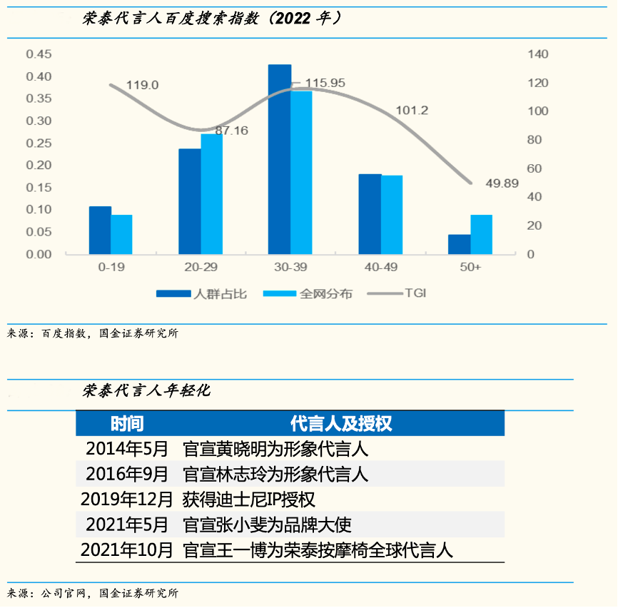 經(jīng)典案例:根據(jù)百度指數(shù)、公司官網(wǎng)、國金證券研究所等綜合資訊表明,家電龍頭企業(yè)自 2021 年以來紛紛官宣當(dāng)紅年輕流量明星為代言人,張小斐因在2021年初主演《你好,李煥英》迅速走紅,榮泰健康公司2021年先啟用張小斐為代言人,快速跟上熱點(diǎn),并于10 月官宣流量更高的王一博。從 2014 年邀請黃曉明代言到2021 年,公司傳播主攻人群轉(zhuǎn)年輕消費(fèi)者群體。