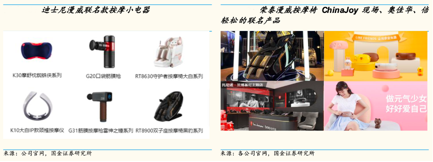 經(jīng)典案例:根據(jù)公司官網(wǎng)、國金證券研究所等綜合資訊表明,榮泰健康公司借鑒對標(biāo)BODYFRIEND,BODYFRIEND 曾與迪士尼米老鼠、漫威系列聯(lián)名推出按摩器具。公司 2019 年 底與迪士尼合作,與其旗下知名IP 超能陸戰(zhàn)隊(duì)、漫威系列聯(lián)名推出按摩椅 (RT8630 大白系列、RT8900 黑豹系列等)、按摩小電器如筋膜槍、頸部按摩儀系列。