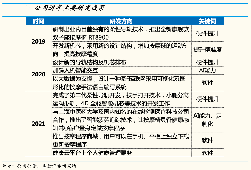 經(jīng)典案例:根據(jù)公司公告、國(guó)金證券研究所等綜合資訊表明,榮泰健康在硬件方面,2019年研制出業(yè)內(nèi)目前獨(dú)有的柔性導(dǎo)軌技術(shù),推出全新旗艦款雙子座按摩椅 RT8900,成為行業(yè)里程碑。其進(jìn)一步優(yōu)化柔性導(dǎo)軌 技術(shù),在2021 年完成了第二代柔性導(dǎo)軌開(kāi)發(fā),扶手打開(kāi)技術(shù),小腿分離運(yùn)動(dòng)機(jī)構(gòu),4D全驅(qū)智能機(jī)芯等技術(shù)的開(kāi)發(fā)工作。