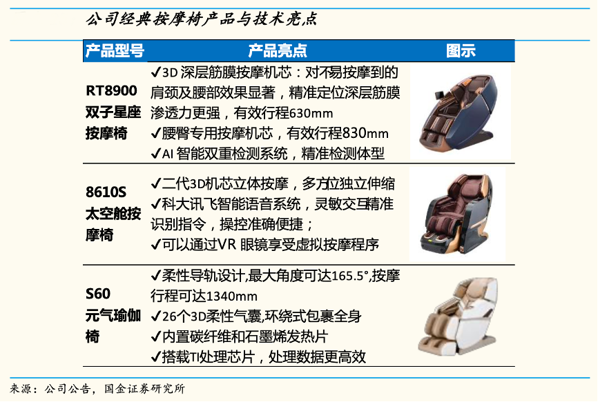 經(jīng)典案例:根據(jù)公司公告、國(guó)金證券研究所等綜合資訊表明,榮泰健康擁有大量?jī)?yōu)秀產(chǎn)品,經(jīng)典按摩椅產(chǎn)品與技術(shù)亮點(diǎn)突出。