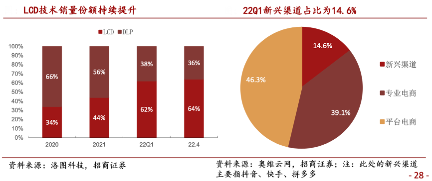 經(jīng)典案例:根據(jù)洛圖科技、奧維云網(wǎng)、招商證券等綜合資訊表明,智能投影主要通過線上銷售,線上銷量占比達(dá)80%以上(洛圖科技),一般通過京東、天貓等傳統(tǒng)電商平臺(tái)購(gòu)買;直播帶貨的發(fā)展,拉動(dòng)抖音、快手等短視頻電商平臺(tái)交易額快速增長(zhǎng),而隨著2021年下半年拼多多加大短視頻業(yè)務(wù)的布局,智能投影品類也從中受益,根據(jù)奧維云網(wǎng)數(shù)據(jù),22Q1智能投影品類在抖音、快手、拼多多等社交電商平臺(tái)市場(chǎng)份額合計(jì)已達(dá)14.6%,4月進(jìn)一步提升至21%。