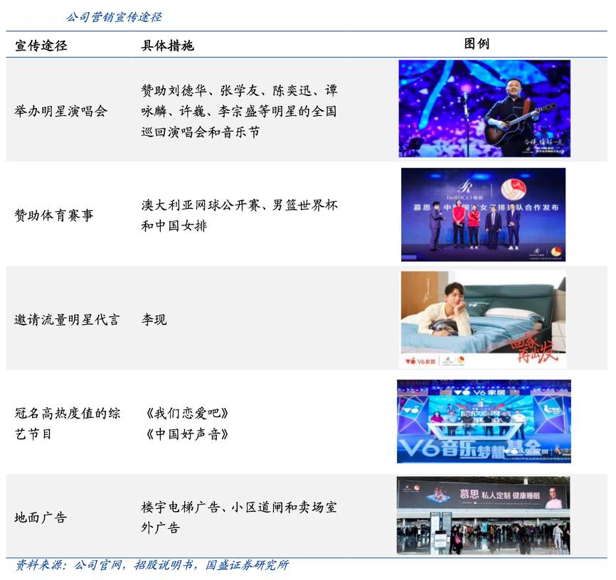 經(jīng)典案例:根據(jù)公司官網(wǎng)、招股說明書、國盛證券研究所等綜合資訊表明,慕思公司以“老人形象”為品牌視覺錘,傳遞 產(chǎn)品專業(yè)、專注、工匠精神的直觀印象,極具品牌辨識度。其舉辦明星演唱會(先后贊助劉德華、張學(xué)友、陳奕迅、 譚詠麟、許巍、李宗盛等明星的全國巡回演唱會和音樂節(jié))、贊助體育賽事(澳大利亞網(wǎng)球公開賽、男籃世界杯和中國女排)、邀請流量明星代言人(李現(xiàn))和冠名高熱度值的綜 藝節(jié)目(《我們戀愛吧》、《中國好聲音》),并加強在與消費者日常距離更近、接觸更頻繁 的地面廣告領(lǐng)域投入資源(樓宇電梯廣告、小區(qū)道閘和賣場室外廣告等),通過持續(xù)廣告投入和宣傳以及體育營銷和名人營銷等跨界合作,提升公司品牌知名度和影響力。