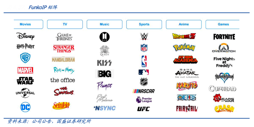 經(jīng)典案例:根據(jù)公司公告、國(guó)盛證券研究所等綜合資訊表明,F(xiàn)unko 產(chǎn)品產(chǎn)品矩陣縱向搭建品牌類型——POP!、Loungefly以及其他品牌,橫向構(gòu)建產(chǎn)品類型——人偶以及其他衍生品(服飾、文創(chuàng)等),通過(guò)大量國(guó)際化 IP 填充矩陣內(nèi)容,拓寬領(lǐng)域延伸產(chǎn)品產(chǎn)業(yè)鏈。Funko產(chǎn)品授權(quán)涵蓋影視、音樂(lè)、體育、游戲、動(dòng)漫多 領(lǐng)域的頭部IP,其中漫威、哈利波特以及曼達(dá)洛人系列常居 2021 各季度 TOP3。
