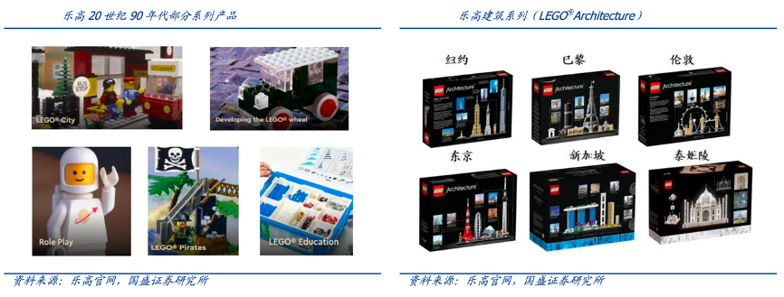 經(jīng)典案例:根據(jù)樂(lè)高官網(wǎng)、國(guó)盛證券研究所等綜合資訊表明,2001-2002年兩年間,星球大戰(zhàn)和哈利波特兩大 IP 的熱銷帶動(dòng)了樂(lè)高該系列一炮而紅,成為樂(lè)高系列中的常青樹(shù)。同時(shí)2007 年樂(lè)高與芝加哥建筑師亞當(dāng)〃里德〃塔克(Adam Reed Tucker)合作,通過(guò)復(fù)刻世界各地標(biāo)志建筑,研發(fā)出樂(lè)高建筑系列(LEGO® Architecture)。差異化產(chǎn)品的同時(shí)也促進(jìn)樂(lè)高本土化,促進(jìn)樂(lè)高文化和當(dāng)?shù)匚幕娜诤稀?