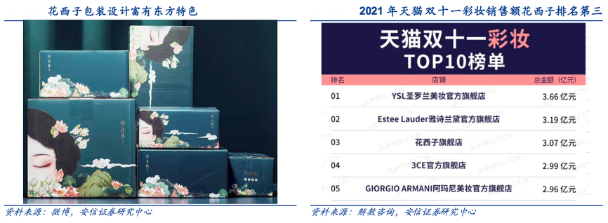 CBO 數(shù)據(jù)顯示,2019 年花西子全網(wǎng)成交額達(dá) 11.3 億元,同比暴漲 25 倍,同時(shí)市占率位列中國(guó)彩妝第 10 名,2020 年全網(wǎng)成交額突破 30 億元,2021 年天貓雙十一銷(xiāo)售額 3.07 億元,位列彩妝類(lèi)目第三,僅次于 YSL 和雅詩(shī)蘭黛。