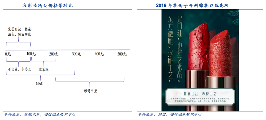 經(jīng)典案例:根據(jù)微博、解數(shù)咨詢(xún)、安信證券研究中心等綜合資訊表明,花西子于 2017 年 3 月誕生,“西子”指西湖亦指西施,“花”蘊(yùn)含了品牌理念“以花養(yǎng)妝”。其創(chuàng)始人花滿(mǎn)天(吳成寶)對(duì)花西子的市場(chǎng)定位是“彩妝+100~200 價(jià)格帶+ 有審美欲求(喜歡國(guó)風(fēng))+有一定消費(fèi)能力”的人群。