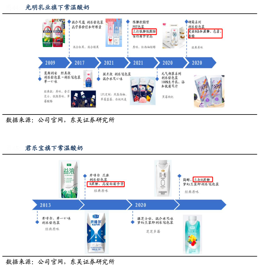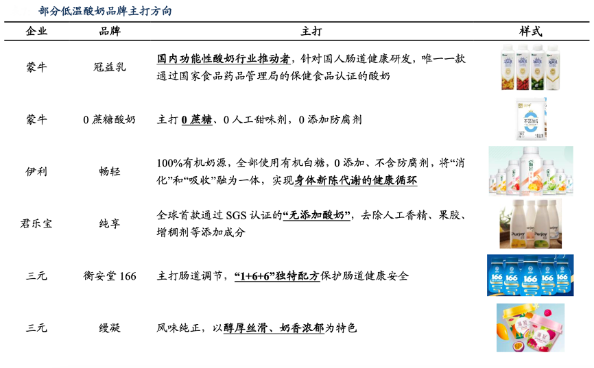經(jīng)典案例:根據(jù)公司公告、新聞?wù)怼|吳證券研究所等綜合資訊表明,以往大多數(shù)消費者并沒有意識到常溫酸奶與低溫酸奶在乳酸菌功能上的差異。因此,越來越多低溫酸奶品牌在宣傳上強調(diào)產(chǎn)品對腸道健康的作用,加強消費者引導(dǎo)。同時,低溫酸奶向口味豐富、無添加、個性化等方向演變,產(chǎn)品升級主打無添加、0糖等健康概念,煥發(fā)新的市場活力。
