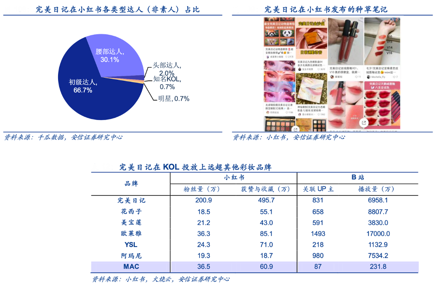 經(jīng)典案例:根據(jù)千瓜數(shù)據(jù)、小紅書、火燒云、安信證券研究中心等綜合資訊表明,完美日記在 KOL 的選擇上采用“金字塔”結(jié)構(gòu),即少量明星和頭部 KOL(粉 絲數(shù)>50 萬)+中量腰部 KOL(粉絲數(shù) 5-50 萬)+大量初級 KOL(粉絲數(shù)<5 萬),頭部 KOL 提升品牌影響力,腰部和初級 KOL 配合度高、營銷費用較低卻也更拉近和消費者之間的距離。截至 2021 年 11 月,完美日記在小紅書擁有粉絲 200.9 萬,遠超其他彩妝品牌。