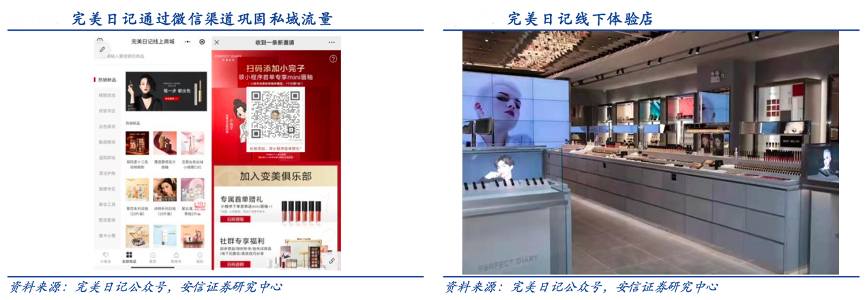 經(jīng)典案例:根據(jù)完美日記公眾號、安信證券研究中心等綜合資訊表明,2018年完美日記開始運營微信商城,并鞏固私域流量,客戶在不同平臺購買商品后引導其掃碼關(guān)注公眾號、添加客服“小完子”并加入社群,與消費者建立更緊密的 溝通、提升復購率。根據(jù)公告,截至 2021 年底完美日記共有 252 家門店,預計到 2022 年共開設(shè) 600 家。線上線下全渠道整合,線上業(yè)務(wù)可以為線下體驗店帶來更多的客流量,而線下體驗店也為線 上平臺進一步引流。