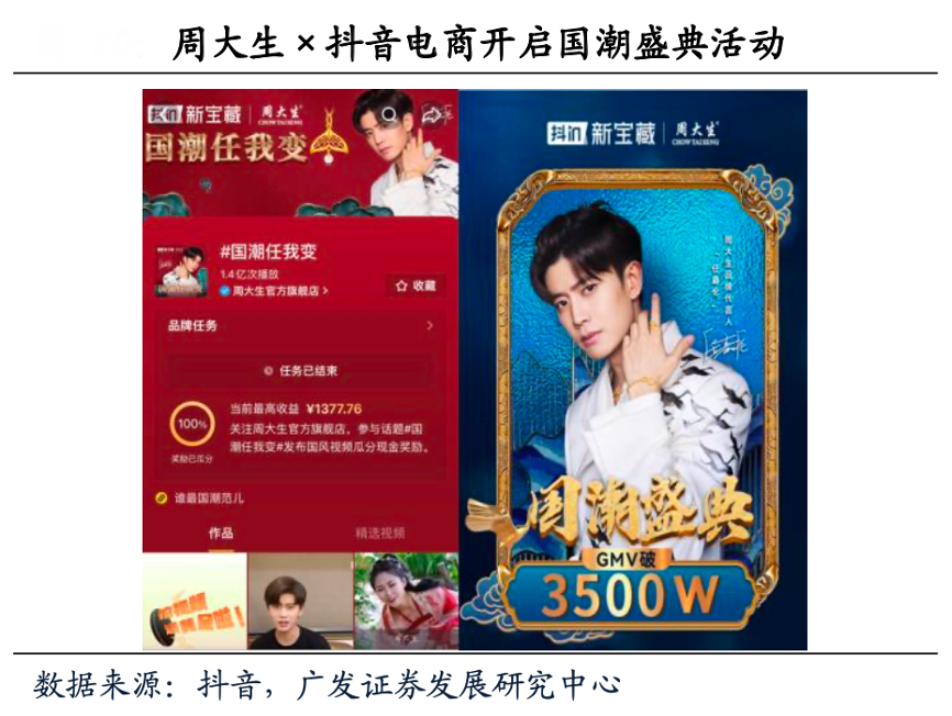 經(jīng)典案例:根據(jù)抖音、廣發(fā)證券發(fā)展研究中心等綜合資訊表明,周大生自2021年起布局“站外種草+平臺直播轉(zhuǎn)化+私域精細(xì)化運(yùn)營”的年輕態(tài)營銷戰(zhàn)略,發(fā)力抖音、小紅書等新興社交電商和興趣電商渠道;4月聯(lián)動抖音電商“抖in新寶藏”開展國潮盛典活動,進(jìn)行總裁直播、達(dá)人直播,達(dá)成平臺聲量超2.2億,GMV 3500萬;“#國潮任我變”抖音話題曝光破1.2億,參與人數(shù)超3.1萬,店鋪粉絲增長超16萬。