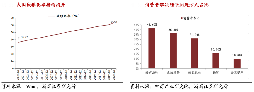 經(jīng)典案例:根據(jù)wind、中商產(chǎn)業(yè)研究院、浙商證券研究所等綜合資訊表明,城鎮(zhèn)化有助于床墊的普及,第七次人口普查城鎮(zhèn)化率當(dāng)前中國(guó)城鎮(zhèn)化率為63.59%、仍有較大提升空間。同時(shí)消費(fèi)習(xí)慣變化帶動(dòng)床墊滲透率提升,根據(jù)《2020 中國(guó)睡眠指數(shù)報(bào)告》,36.1%的消費(fèi)者面臨失眠的問(wèn)題,其中36.3%的消費(fèi)者會(huì)選擇通過(guò)購(gòu)買寢具來(lái)解決睡眠問(wèn)題,消費(fèi)者對(duì)睡眠的重視和對(duì)床墊產(chǎn)品的認(rèn)知都在不斷加深。