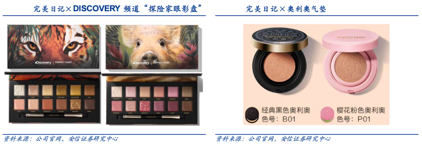 經(jīng)典案例:根據(jù)公司官網(wǎng)、安信證券研究中心等綜合資訊表明,完美日記推出聯(lián)名產(chǎn)品頻率極高,包括大英博物館、DISCOVERY 頻道、中國(guó)國(guó)家地理、大都會(huì)藝術(shù)博物館以及三麗鷗、奧利奧等。其以“探險(xiǎn)家十二色眼影盤”為例,其 抓住動(dòng)物保護(hù)這一話題熱點(diǎn),分別以小豬、鱷魚、冰狼、斑虎為靈感推出四種色系的“野性”眼影盤,引發(fā)熱議,剛發(fā)售時(shí)一周銷量超過(guò)二十萬(wàn)。