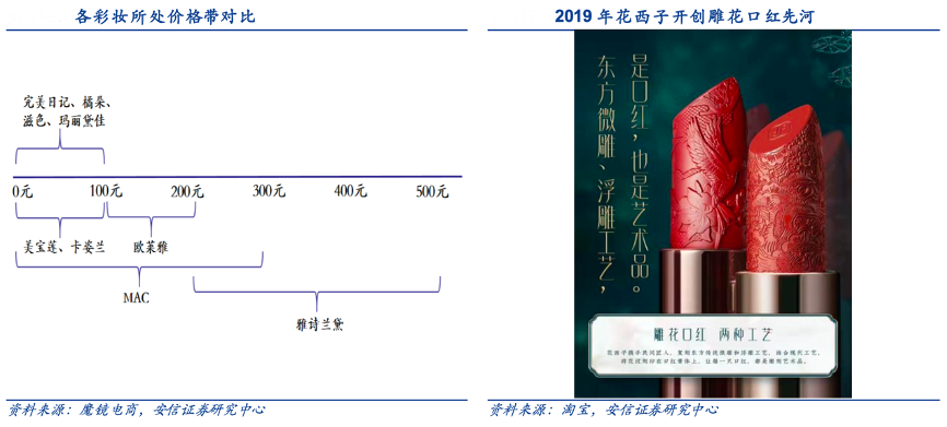 經(jīng)典案例:根據(jù)魔鏡電商、淘寶、安信證券研究中心等綜合資訊表明,在定價上,國際大牌散粉價格大都在 300 元以上,國產(chǎn)品牌在百元以下,花西子卡位市場空白,定價 150 元左右,競品少、精準(zhǔn)吸引目標(biāo)客群,蜜粉也成為花西子第一款爆款產(chǎn)品。