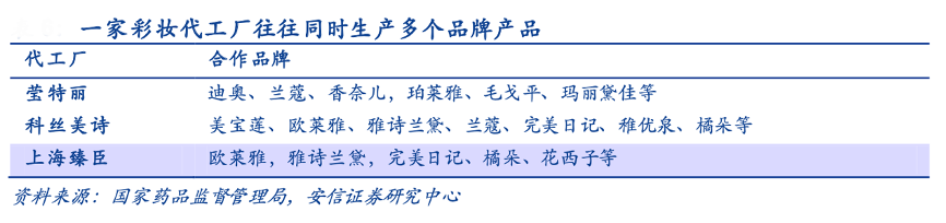 經(jīng)典案例:根據(jù)國家藥品監(jiān)督管理局、安信證券研究中心等綜合資訊表明,包括科絲美詩、瑩特麗、上海臻臣、諾斯貝爾等在內(nèi)的代工廠往往會生產(chǎn)多個品牌的產(chǎn)品,因此“平替”頻出。對于低端彩妝,消費(fèi)者對溢價敏感度高,一旦產(chǎn)品提價超過心理預(yù) 期,就會尋找下一個“平替 ”,因此品牌調(diào)性高的高端彩妝品牌將擁有更高的競爭壁壘。