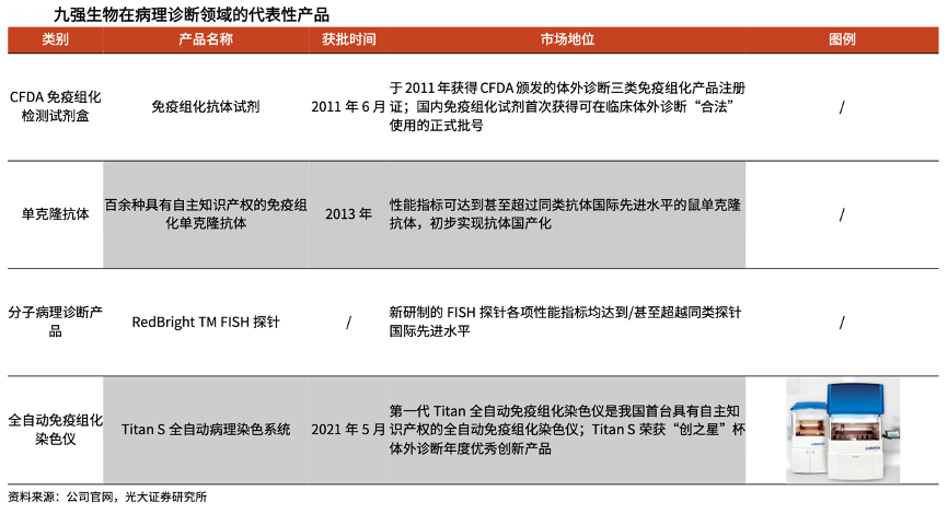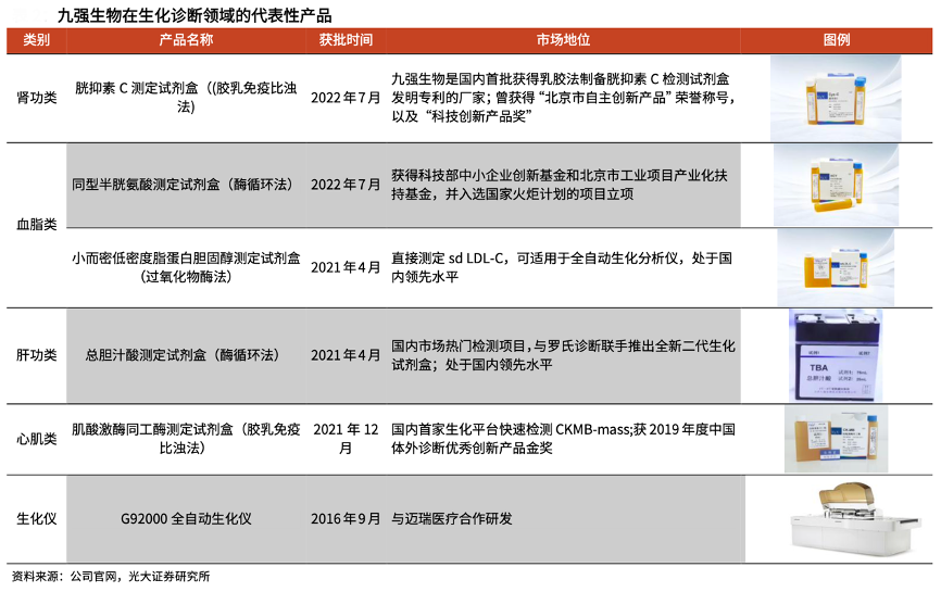 經(jīng)典案例:根據(jù)公司官網(wǎng)、光大證券研究所等綜合資訊表明,自成立以來,九強(qiáng)生物公司始終致力于生化試劑的研發(fā)、生產(chǎn)和銷售,在生化領(lǐng)域占據(jù)國產(chǎn)第一梯隊(duì)。目前,公司主要診斷試劑種類有肝功類、腎功類、血脂類、心肌損傷、特種蛋白 和糖代謝類生化指標(biāo)。公司率先在國內(nèi)推出 HCY、胱抑素 C、生化同平臺(tái)檢測(cè) PSA/fPSA、小而密低密度脂蛋白、CK-MB mass(生化平臺(tái))等檢測(cè)項(xiàng)目。其中,胱抑素 C、同型半胱氨酸、小而密低密度脂蛋白膽固醇等高端診斷試劑處于國內(nèi)領(lǐng)先水平。