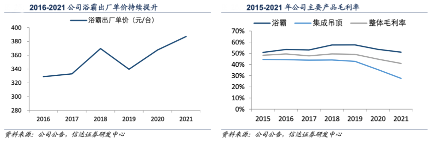 經(jīng)典案例:根據(jù)公司公告、信達(dá)證券研發(fā)中心等綜合資訊表明,奧普主力浴霸產(chǎn)品優(yōu)勢(shì)領(lǐng)先盈利良好,從毛利率看,公司浴霸產(chǎn)品毛利率基本維持在 50%以上,其中 2020 年整體毛利率下滑,根據(jù)公司公告,主要由于運(yùn)輸費(fèi)用會(huì)計(jì)政策變化所致。集成吊頂產(chǎn)品毛利率在 2021 年下滑較大,一方面由于原材料價(jià)格上漲,另一方面由于低毛利工程家裝渠道占比上升所致。