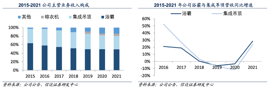 經(jīng)典案例:根據(jù)公司公告、信達(dá)證券研發(fā)中心等綜合資訊表明,2021年奧普公司主要產(chǎn)品系列分別為浴霸、集成吊頂、晾衣機(jī),營(yíng)業(yè)收入分別為 10.08 億元、6.48 億元、1.09 億元,其中主力產(chǎn)品浴霸與集成吊頂分別占公司總營(yíng)收的 49%、31%。