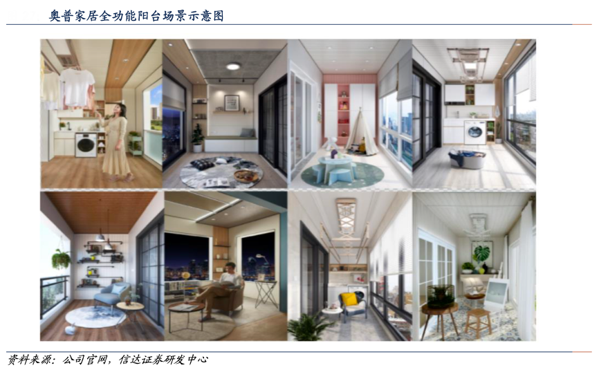 經(jīng)典案例:根據(jù)公司官網(wǎng)、信達(dá)證券研發(fā)中心等綜合資訊表明,奧普公司將銷售單品拓展至銷售產(chǎn)品組合與局部空間整裝解決方案,將產(chǎn)品線擴充到全屋空間,實現(xiàn)業(yè)務(wù)由點到面,從而提高客單值。2020年,奧普推出“全功能陽臺 4.0”,面向用戶提供更多的陽臺使用場景,開辟了四大產(chǎn)品主線和七大陽臺生活方式,包括快裝系統(tǒng)、收納系統(tǒng)、晾曬系統(tǒng)、燈光系統(tǒng)四大產(chǎn)品主線,包含“洗衣空間、晾曬空間、茶歇空間、園藝空間、健身空間、書房空間、親子空間”七彩陽臺新生活。