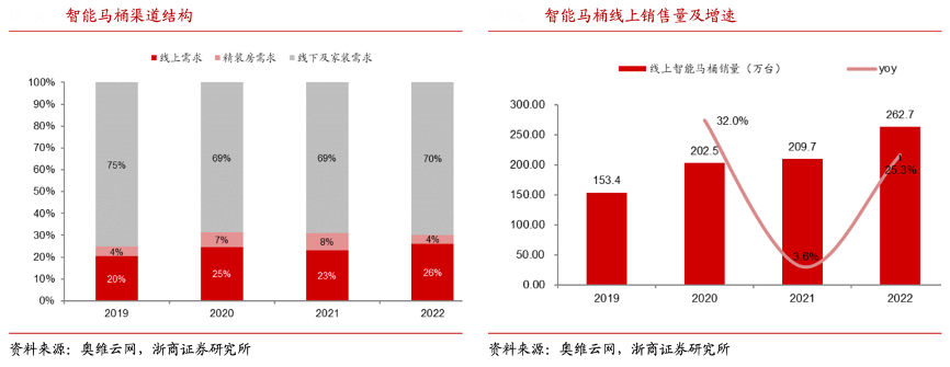 經(jīng)典案例:根據(jù)奧維云網(wǎng)、浙商證券研究所等綜合資訊表明,近年電商和家裝新渠道崛起分流,特別是智能家居品類線上銷售占比更高。以智能馬桶為例,根據(jù)奧維云網(wǎng),2022年線上銷售量達(dá) 262.7 萬(wàn)臺(tái),2019-2022 年復(fù)合增速 20%, 線上渠道占比 26%,相比 2019 年提升了 6pct。