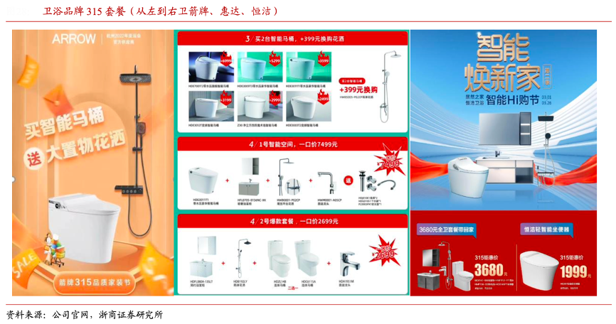 經(jīng)典案例:根據(jù)公司官網(wǎng)、浙商證券研究所等綜合資訊表明,國(guó)貨主打智能馬桶為核心的套餐銷售,優(yōu)勢(shì)擴(kuò)大,市占提升。國(guó)貨品牌主推套餐銷售,比如 2023 年 315 活動(dòng),箭牌推出買智能馬桶送花灑,買雙衛(wèi)送定制購(gòu)物金。2021 年箭牌以客戶購(gòu)買 1 個(gè)潔具產(chǎn)品為例(蹲 便器/坐便器),花灑/浴室柜/淋浴房配套率分別為55%/31%/8%,且呈上升態(tài)勢(shì)。
