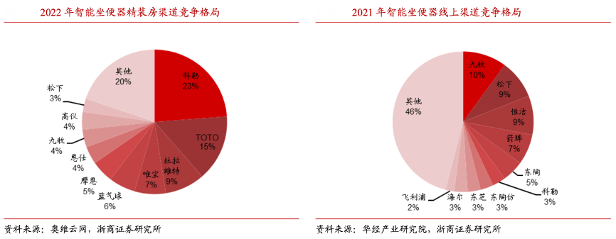 經(jīng)典案例:根據(jù)奧維云網(wǎng)、浙商證券研究所等綜合資訊表明,精裝修衛(wèi)浴市場外資品牌份額67.9% (TOP3為科勒、TOTO、摩恩),內(nèi)資品牌份額為32.1%(TOP3 為九牧、箭牌、歐派),以智能坐便器單品為例,位列前三的科勒/TOTO/杜拉維特市占分別為 23%/15%/9%。同時(shí)以智能坐便器新興線上渠道格局為例,國貨九牧、恒潔、箭牌位列市占第1、3、4(市占率分別為 10%,9%,7%)。