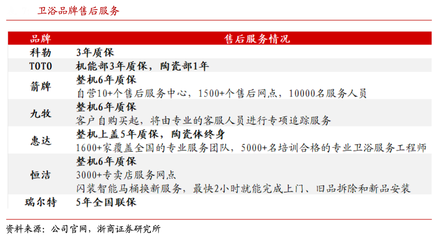 經(jīng)典案例:根據(jù)公司官網(wǎng)、浙商證券研究所等綜合資訊表明,智能衛(wèi)浴產(chǎn)品易損率高,售后服務(wù)是保證用戶體驗(yàn)必不可少的一環(huán)。外資品牌科勒、TOTO 智能坐便器質(zhì)保期均在 3 年,國產(chǎn)品牌箭牌、九牧、恒潔 6 年整機(jī)質(zhì)保;同時(shí)箭牌配備 1500 家售后網(wǎng)點(diǎn)和上萬名服務(wù)人員,恒潔 3000+專賣店服務(wù)網(wǎng)點(diǎn),可提供上門換新和維修服務(wù)。