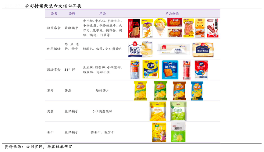 經(jīng)典案例:根據(jù)公司官網(wǎng)、華鑫證券研究等綜合資訊表明,鹽津鋪子公司近年來持續(xù)打造產(chǎn)品力,實施大單品戰(zhàn)略,2022 年,公司持續(xù)做大做強“鹽津鋪子”辣鹵零食、“31°鮮”深海零食、“憨豆爸爸”烘焙食品、“薯之惑” 焙烤薯片、“蒟蒻滿分”蒟蒻果凍、蜜餞果干六大核心品類。