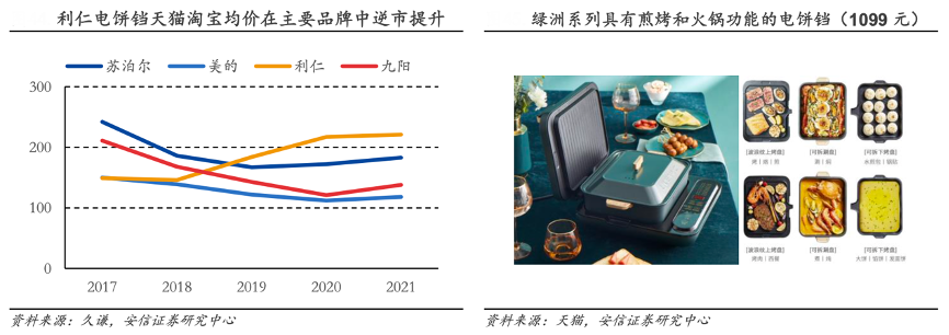 經(jīng)典案例:根據(jù)久謙、天貓、安信證券研究中心等綜合資訊表明,利仁公司電餅鐺產(chǎn)品不斷推陳出新,通過增加鍋類配件和改變產(chǎn)品形態(tài),產(chǎn)品實(shí)現(xiàn)了煎烤涮煮等多種烹飪方式。產(chǎn)品功能的增加也提高了產(chǎn)品附加價(jià)值。根據(jù)久謙數(shù)據(jù),利仁電餅鐺產(chǎn)品 2021 天貓均價(jià)較 2017 年提升 48.3%,為主要品牌中均價(jià)唯一提升的品牌。