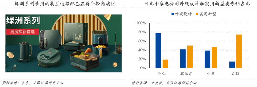 經(jīng)典案例:根據(jù)京東、企查查、安信證券研究中心等綜合資訊表明,利仁公司綠洲系列的配色和設(shè)計(jì)偏向年輕化,在外觀設(shè)計(jì)上具有優(yōu)勢(shì)。公司于 2019 年末推出了綠洲系列產(chǎn)品,產(chǎn)品包含電餅鐺、空氣炸鍋等多個(gè)廚電產(chǎn)品。綠洲系產(chǎn)品的成功,主要來源于公司在外觀設(shè)計(jì)上的厚積薄發(fā)。公司的專利類別中 77%約為外觀設(shè)計(jì)專利,在主要小家電公司中占比最高。