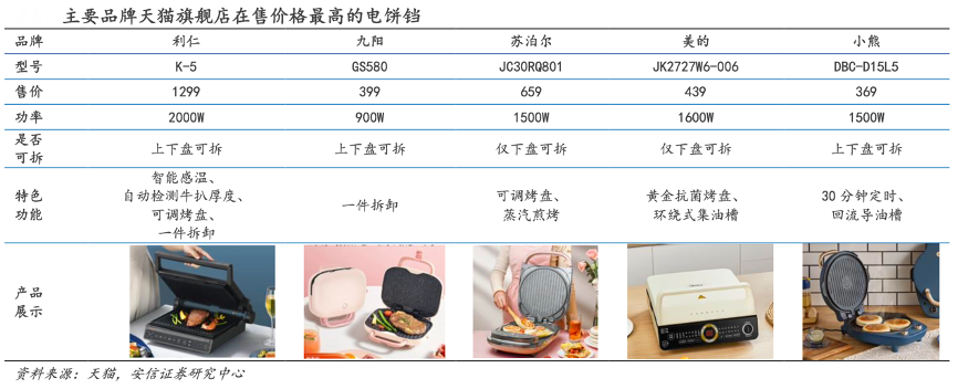 經(jīng)典案例:根據(jù)天貓、安信證券研究中心等綜合資訊表明,結(jié)合奧維數(shù)據(jù),利仁公司 2021 年煎烤機品類線上均價為 206 元,美的/九陽/蘇泊爾均價分別為 129 元/141 元 /174 元,公司煎烤機均價高于主要競爭品牌。K-5 為公司線上在售煎烤機最貴的型號,除了產(chǎn)品功能及智能化程 度較高外,該產(chǎn)品的價格遠(yuǎn)高于其它主要品牌的最貴型號。利仁通過差異化的高端產(chǎn)品,打開了行業(yè)煎烤機的價格天花板,和其它品牌展開錯位競爭。